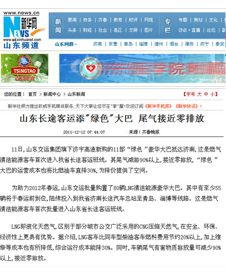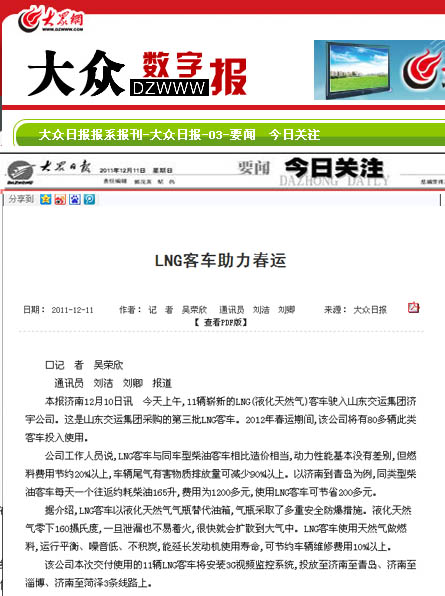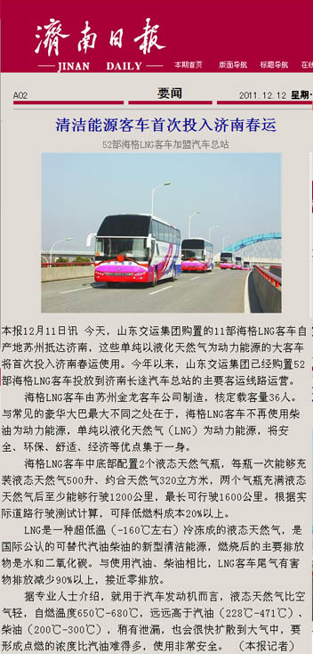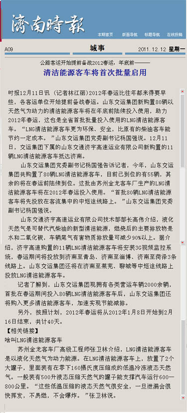 在采訪活動中,采訪團深入蘇州金龍客車制造車間,觀看了車輛從車架組裝、整車陰極電泳到制動配制等流水制造的全過程,體驗了客車制造的嚴密工序;在金龍客車廠產品展室,記者們了解了蘇州金龍客車廠的發展歷史及企業安全文化,對燃氣清潔能源客車所應用的新技術、新工藝、新材料有了更進一步的認識;在蘇州金龍客車廠會議室,總工程師張衛林將燃氣清潔能源客車與汽油、柴油等能源客車進行比對,向記者詳細介紹了燃氣清潔能源環保客車在安全、環保、節能等方面的優勢;在“山東交運集團清潔能源環保客車交車儀式”上,各新聞媒體記者又對本次燃氣清潔能源環保客車車輛安全運營、節能減排、線路投放等情況,進行了現場采訪和隨行拍攝。12月9日晚22點,集團公司燃氣清潔能源環保客車車隊經一路跋涉平安抵濟,12月10日晚,省電視臺山東衛視頻道在《新聞聯播》欄目、濟南市電視臺濟南新聞頻道在《濟南新聞》欄目以及《大眾日報》、《齊魯晚報》、《山東商報》、《生活日報》、《現代交通報》、《濟南日報》、《濟南時報》、《交通廣播》等媒體都對集團公司燃氣清潔能源環保客車投入春運情況進行了重點報道。