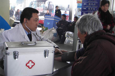 車站醫務室黨員魏德泉在候車長廊內設立了便民醫療咨詢服務站,為乘車旅客提供便民服務。