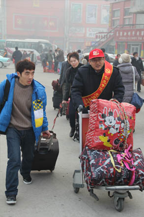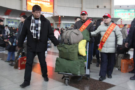 春運期間,盡管客流量較大,但集團公司各項創先爭優活動和惠民服務措施始終有效開展。圖為集團公司總部黨員、團員組成小紅帽送溫暖義務服務隊、愛心志愿車隊,為旅客積極服務,受到廣大旅客歡迎。