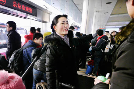 集團公司各車站黨員干部在春運中深化創先爭優,發揮黨員先鋒模范帶頭作用。圖為總站金牌檢票員李文為旅客熱情導乘。