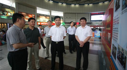 7月19日上午,山東省國(guó)資委黨委副書(shū)記、紀(jì)委書(shū)記岳濱一行蒞臨集團(tuán)公司調(diào)研指導(dǎo)工作。集團(tuán)公司董事長(zhǎng)吳宗昌、總經(jīng)理王謙及部分領(lǐng)導(dǎo)班子成員陪同調(diào)研。期間,吳宗昌董事長(zhǎng)匯報(bào)了集團(tuán)公司基本概況和黨建、黨風(fēng)廉政建設(shè)工作開(kāi)展情況,岳書(shū)記在聽(tīng)取匯報(bào)后,與在座集團(tuán)領(lǐng)導(dǎo)進(jìn)行了深入座談,并做重要指示。最后,岳書(shū)記一行來(lái)到濟(jì)南長(zhǎng)途汽車總站進(jìn)行實(shí)地參觀指導(dǎo),與正在義務(wù)為旅客送水的十八大代表李文親切交談,并對(duì)總站女士售票窗口、人臉識(shí)別、3G視頻監(jiān)控等安全舉措給予了高度評(píng)價(jià)和肯定。