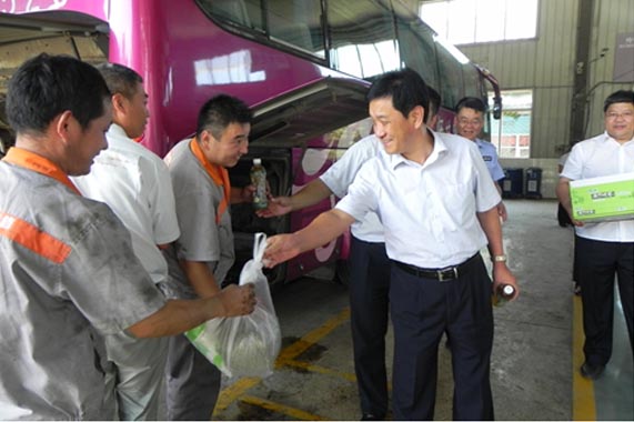在汽車(chē)總站,吳董一行為奮戰(zhàn)在一線(xiàn)的員工送上內(nèi)含小風(fēng)扇、毛巾、清涼油、藿香正氣丸等防暑降溫物品的“清涼包”,對(duì)各崗位員工在炎熱天氣里堅(jiān)守崗位、無(wú)私奉獻(xiàn)的精神給予肯定和感謝, 鼓勵(lì)大家時(shí)刻保持干勁,在工作中多創(chuàng)佳績(jī),同時(shí)一定要注意防暑,保證健康。座談期間,吳董詳細(xì)聽(tīng)取了總站“三嚴(yán)三實(shí)”教育工作匯報(bào),對(duì)黨建工作與生產(chǎn)經(jīng)營(yíng)相結(jié)合等問(wèn)題進(jìn)行了指導(dǎo),對(duì)下半年的各項(xiàng)工作提出了三點(diǎn)要求:一是要采用集體學(xué)習(xí)與個(gè)人學(xué)習(xí)相結(jié)合、與中心組學(xué)習(xí)相結(jié)合、與民主生活會(huì)相結(jié)合的方式,進(jìn)一步抓好“三嚴(yán)三實(shí)”專(zhuān)題教育的學(xué)習(xí)和落實(shí);二是開(kāi)展“三嚴(yán)三實(shí)”專(zhuān)題教育要結(jié)合生產(chǎn)經(jīng)營(yíng)實(shí)際,以“三嚴(yán)三實(shí)”理論為基礎(chǔ)、精神為統(tǒng)領(lǐng),促進(jìn)各項(xiàng)工作順利開(kāi)展;三是總站領(lǐng)導(dǎo)班子要以身作則,無(wú)論在生活上還是個(gè)人修養(yǎng)上,都要起到引領(lǐng)示范作用,始終保持良好的精神狀態(tài),帶領(lǐng)廣大員工為完成全年工作任務(wù)而不懈努力。