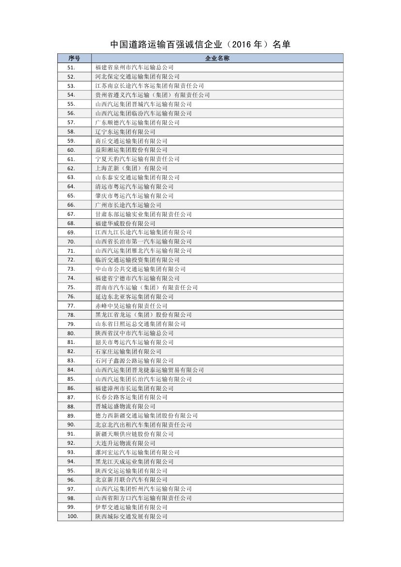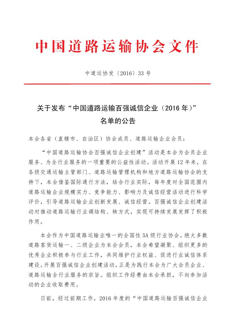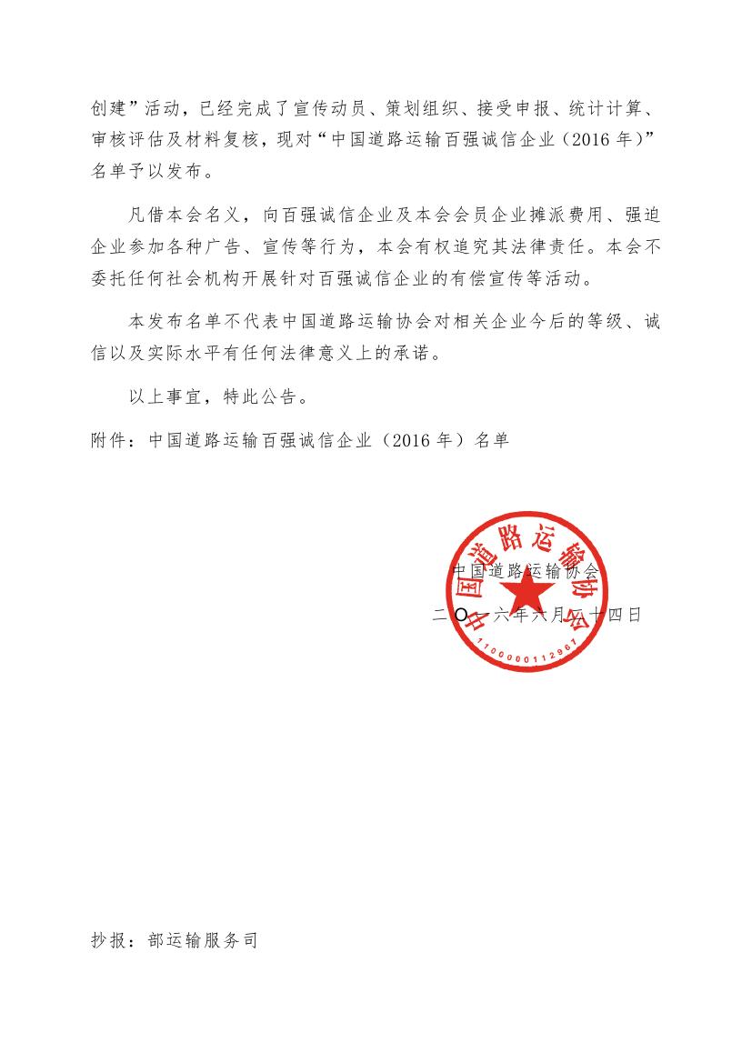 6月24日,中國道路運輸協會發布了2016年度道路運輸百強誠信企業名單,集團再度榮獲“全國道路運輸百強誠信企業”稱號,排名第十一位,比去年前進一個名次。