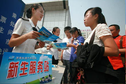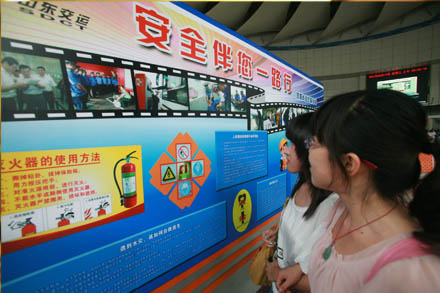 臨近中秋假期,總站推出“仲秋送紅包”的活動,為在總站網站預訂三張以上仲秋當日客票的旅客送出 “仲秋紅包”——會員優惠卡,為旅客的“團圓”之旅增添一份愉悅的感受;此外,各大高校開學在即,總站特別在旅客到達區設立了新生服務站,開通便利接站的綠色服務通道,為廣大新生及家長提供各種班次信息和引導,幫助新生順利到校;為保證節日期間旅客運輸安全,總站進一步強化了對班車和站區的安保力度,在候車大廳設立了消防器材使用、緊急逃生技巧等內容的安全常識展板,為過往旅客普及安全知識,提高安全意識。