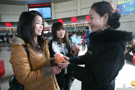 為保障藝考生順利“趕考”,站務(wù)員來(lái)到舜耕國(guó)際會(huì)展中心等市內(nèi)各考點(diǎn),向參加考試的萬(wàn)余藝考生發(fā)放總站班次時(shí)刻表,并以充足的運(yùn)力為依托,在考點(diǎn)分布集中的濰坊、淄博、青島等線路上開(kāi)出了“藝考直通車”,實(shí)行現(xiàn)場(chǎng)售票現(xiàn)場(chǎng)發(fā)車,直接將考生送往考點(diǎn);面對(duì)藝考大軍就餐難的現(xiàn)狀,在考生相對(duì)集中的濟(jì)南舜耕國(guó)際會(huì)展中心設(shè)立了現(xiàn)場(chǎng)售餐點(diǎn),針對(duì)考生群體設(shè)計(jì)了營(yíng)養(yǎng)實(shí)惠的套餐盒飯;在站內(nèi)實(shí)行藝考生憑有效證件購(gòu)票八五折優(yōu)惠,總站工作人員還將一個(gè)個(gè)寓意“成功”的橙子、寫滿祝福的精美卡片連同總站的班次時(shí)刻表送給他們,祝福藝考生前程似錦、心想事成。另外,總站也提前加密相關(guān)線路發(fā)車頻率、延遲末班車發(fā)車時(shí)間,多措并舉服務(wù)藝考學(xué)生,全方位為藝考學(xué)生打造了高效、快捷的藝考綠色通道。