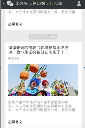 活動(dòng)規(guī)定,凡在一周內(nèi)集滿38個(gè)“贊”的微信圈內(nèi)好友,均有機(jī)會(huì)參加第四客運(yùn)公司組織的免費(fèi)近郊暢游極地海洋世界和歐樂寶活動(dòng)。信息一經(jīng)發(fā)出,很快就在好友圈內(nèi)迅速擴(kuò)散、轉(zhuǎn)發(fā),間接公眾影響力達(dá)1500余人,最后,率先集滿“贊”的10名微信好友獲得了免費(fèi)近郊游機(jī)會(huì)。在