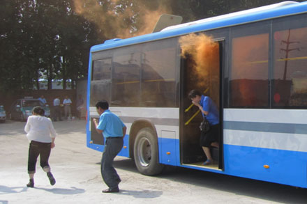 此次綜合應急演練共設置了“三品檢查”、“處理突發事件”、“逃生應急演練”、“ 心肺復蘇救護演示”、“消防滅火”和“防汛搶險救災”等多個演練科目。三品檢查模擬了乘務員對上車乘客依次進行攜帶物品檢查,對發現的汽油等易燃品及時進行處理,禁止乘客登乘;處理突發事件模擬了一名精神病患者在客運站人員密集場所拿棍棒滋事,針對這一突發事件,場站工作人員迅速報警并采取果斷行動,用鋼叉等工具制服滋事者并移送公安機關,有效保障了乘客的人身安全;逃生應急演練由區交通局工作人員講解安全錘的正確使用,然后釋放煙霧模擬車輛發生火災,乘客用毛巾等物品捂住口鼻防止嗆傷,駕駛員組織乘客有序逃離起火車輛,并立即撥打119報警求助;心肺復蘇救護詳細的演示了救護員對患者從最初的病情判斷、清除口鼻異物、人工呼吸、胸外按壓等一系列動作;消防演練模擬了在汽車站突然發生的一場由廢棄燃料引發的火災,現場工作人員立即啟動應急預案,滅火小組迅速展開行動,手持滅火器將火災及時撲滅;防汛演練模擬汛情發生后,應急預案立即啟動,迅速集合搶險救災車輛、物資和人員,快而有序地派往汛情發生地。