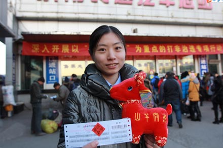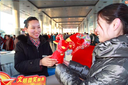 落實優質服務,打造溫馨車站   根據節日和旅客出行特點,推出特色服務和創新舉措。檢票科推出“承諾服務”公示服務項目,發揮“巾幗文明示范崗”的品牌優勢,做好旅客出行便利貼、愛心地圖、問不倒服務崗等百項服務;售票科推出“祝福隨票送,羊年送吉祥”,把誠摯的祝福和羊年吉祥物隨著客票一起送給旅客。