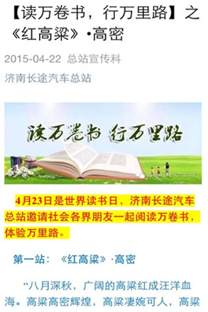 不僅如此,總站還制作了“讀萬卷書,行萬里路”系列專題微信,通過總站官方微信、總站官方微博,以圖文并茂的形式進行推送。專題內(nèi)容包含當下熱銷書籍及相關介紹,倡導大家親臨故事現(xiàn)場,切身體會主人公的心路歷程,同時也為總站傳播文化、加強文化建設開辟了新途徑。