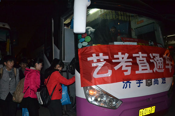 2月26日,濟南長途汽車總站的10余輛“藝考直通車”開進了濟南藝考培訓基地,接送廣大學子前往青島、聊城等地趕考。