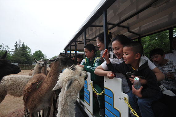 在建成不久的新濟南野生動物世界,福娃們在“愛心爸媽”的細心呵護下,乘坐小火車觀光游覽,與野生動物“親密接觸”,零距離觀察和了解麋鹿、斑馬、駱駝等動物的生活環(huán)境與生活習性,并興致勃勃地觀看了精彩紛呈的動物表演,歡樂的笑聲回蕩在整個公園。
